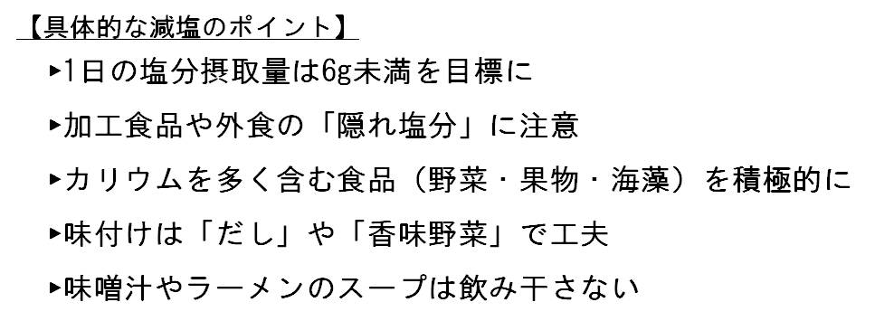 高齢者や筋力低下が気になる方にとって、減塩は単なる血圧対策ではありません。筋肉を守るための栄養戦略でもあります。特にフレイル(虚弱)やサルコペニアのリスクがある方は、以前よりいわれている運動、タンパク摂取に加えて塩分の摂りすぎに注意が必要です。