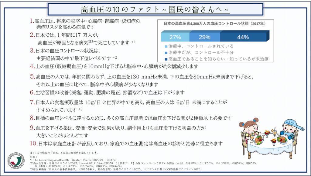 2025年8月に発行された日本高血圧学会の高血圧治療に関するガイドラインでは高血圧の治療の基本は生活習慣特に塩分制限、野菜、果物の積極的摂取、運動、ストレスの回避といったものであると明言されています。同時期に厚生労働省は高血圧の10のファクト(表)を発表しています。この中でも6、7番目に塩分や生活習慣について書かれています。自分の塩分摂取量は尿検査でナトリウムを測定することで推測できます。