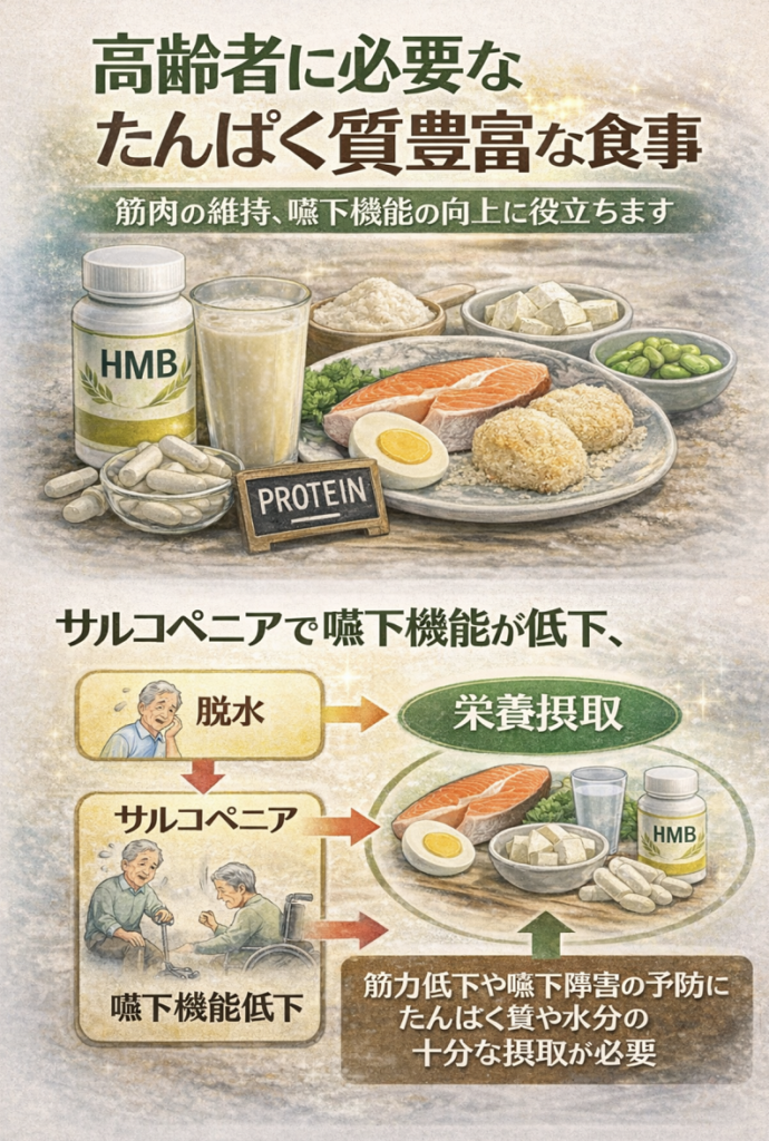 では、その筋肉を守るために必要なものは何でしょうか。重要なのは、十分なエネルギーを確保すること、タンパク質をしっかり摂ること、そして口から安全に食べ続けられる力を守ることです。運動だけでなく、食べることと飲み込めることがそろって、はじめて筋肉は守られます。