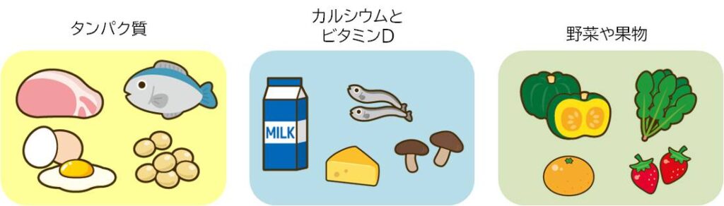 私は患者さんに「背骨を支える三本柱」として、①タンパク質、②カルシウム・ビタミンD、③抗酸化作用のある野菜や果物を意識した食事をすすめています。
